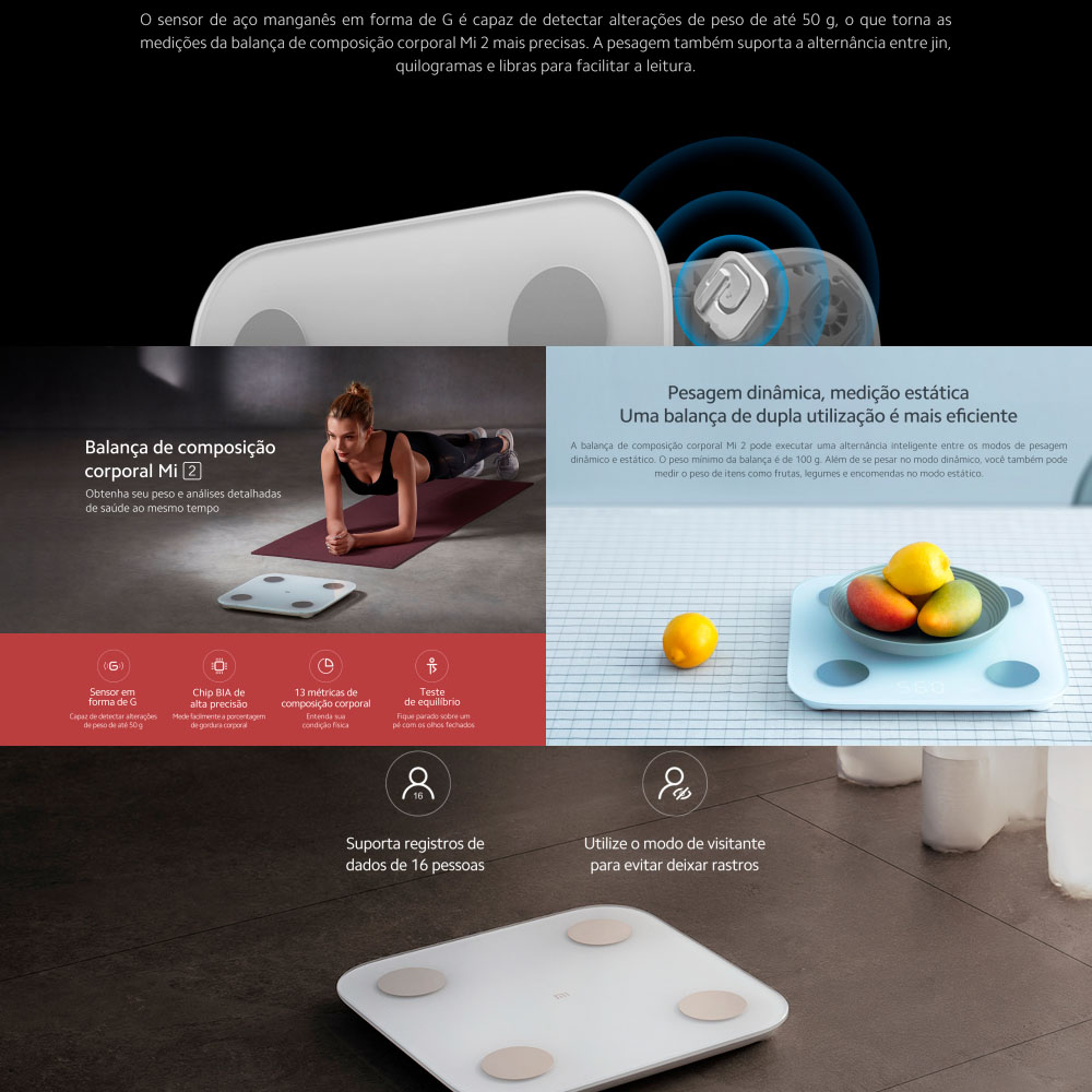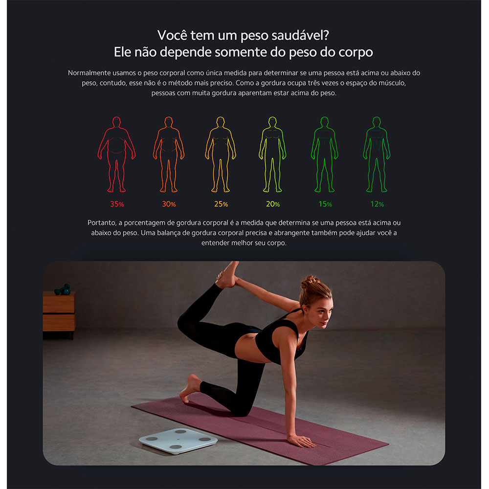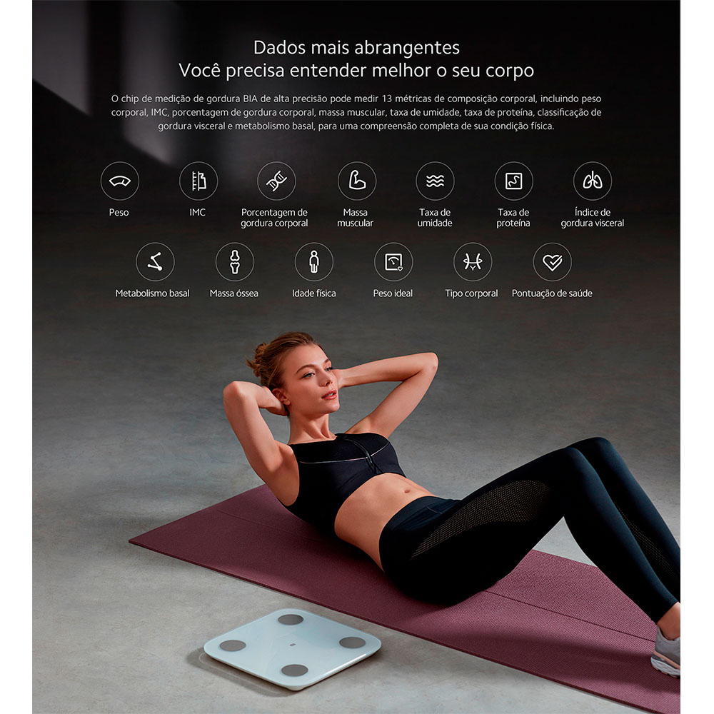 Além do peso corporal, também te dá uma imagem realista do teu bem-estar e fitness com 13 pontos de dados, como composição do corpo, volume do músculo etc.