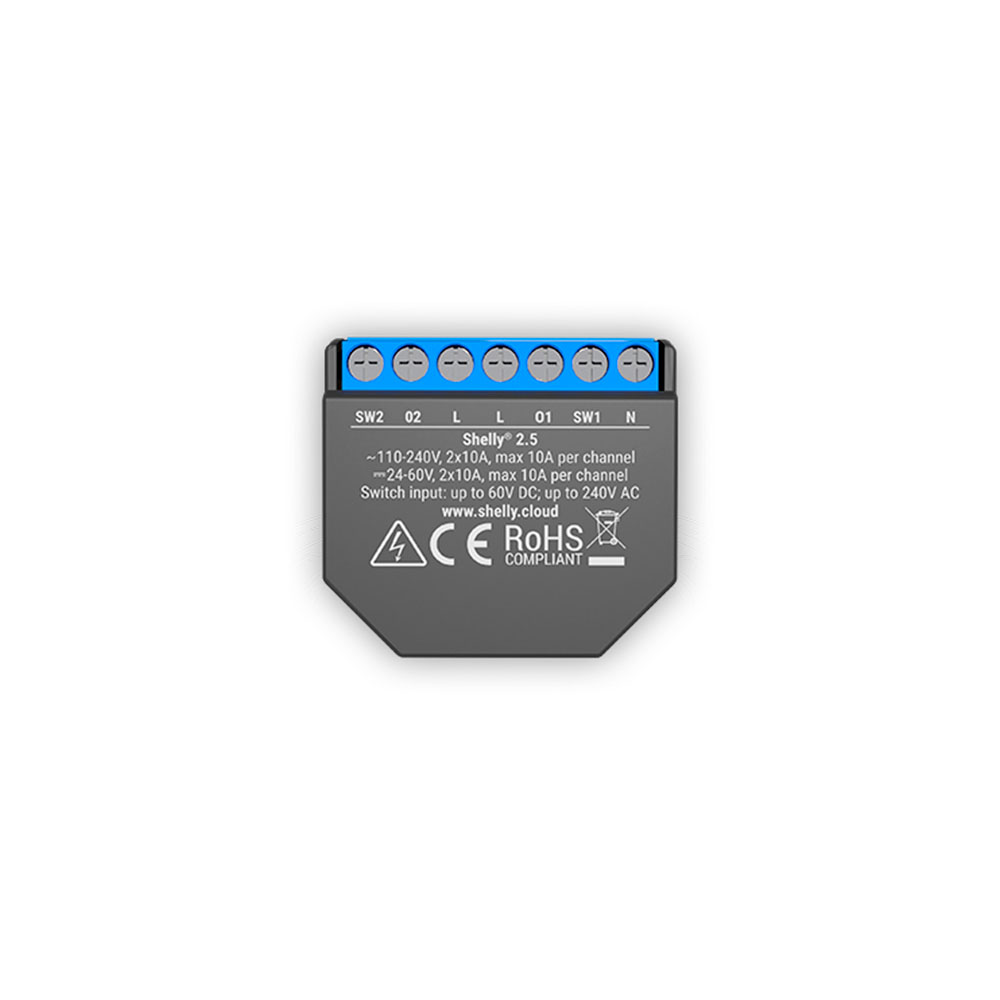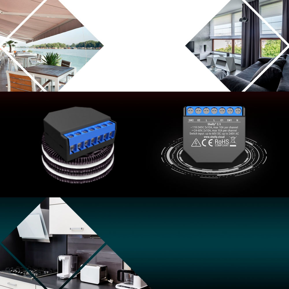 Shelly 2.5 controla uma ampla gama de eletrodomésticos e equipamentos de escritório (luzes, linhas elétricas, portas de garagem, cortinas, sistemas de segurança, radiadores de aquecimento, condicionadores de ar, etc.) de qualquer lugar com o menor interruptor de relé duplo operado por WiFi com funcionalidade de persiana no mundo ? Shelly 2.5