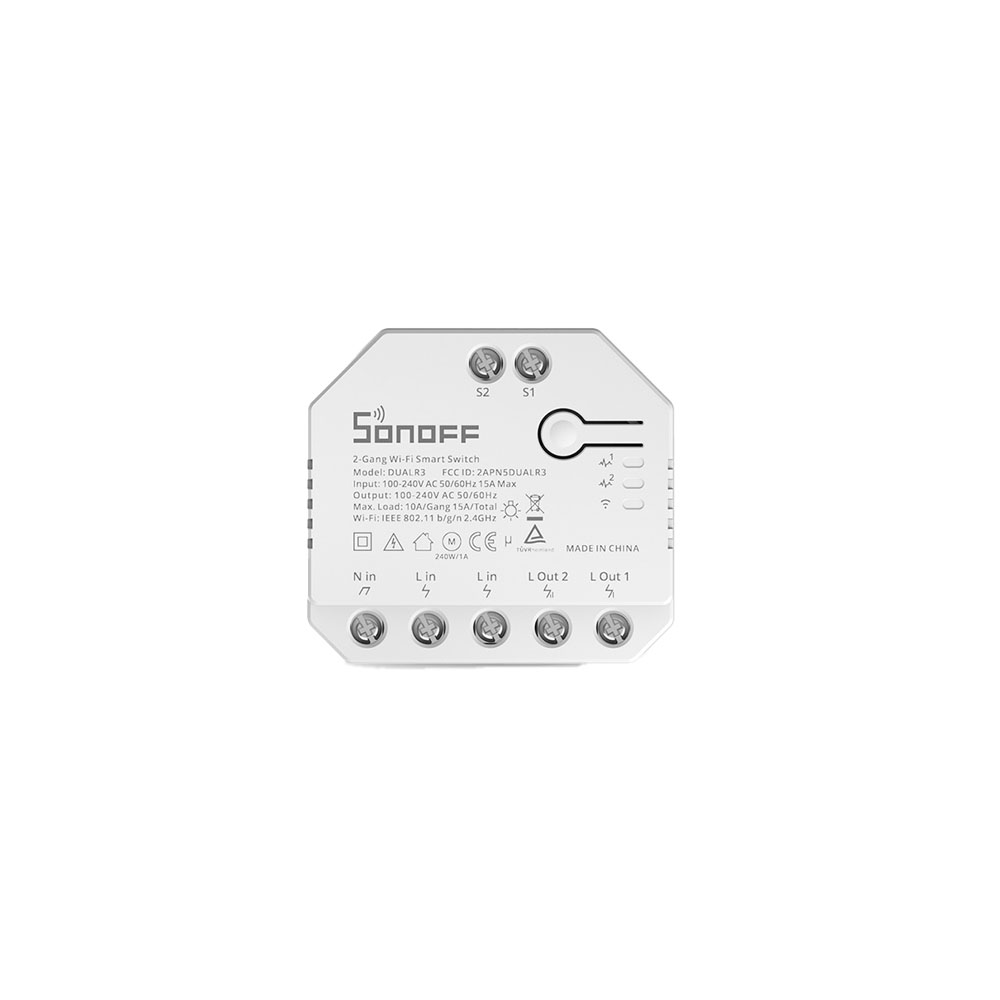 Sonoff DUALR3 deixa as suas cortinas elétricas, persianas, etc. se tornarem inteligentes imediatamente. O 2-Gang detecta os valores de tensão, corrente e energia e conta o consumo de energia para você de forma independente para permitir um controle razoável do consumo de energia. O DUALR3 possui três modos de trabalho que atendem às necessidades de diferentes cenários de aplicação. Controle remoto, temporização, controle de voz, cenas inteligentes e outras funções estão disponíveis.