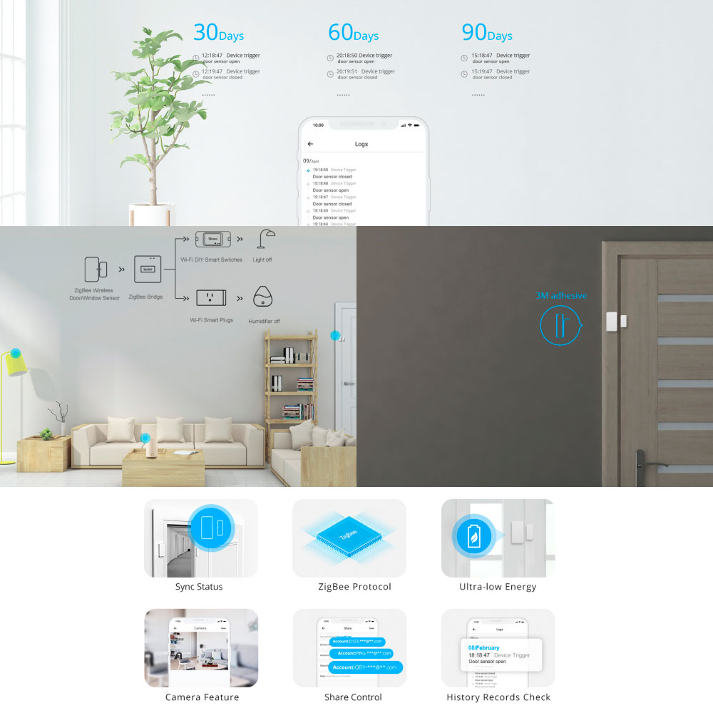 Usando adesivo 3M para montar facilmente o sensor em seus locais ideais. Substitua a bateria a tempo com uma notificação quando a vida útil da bateria for 10% restante.
