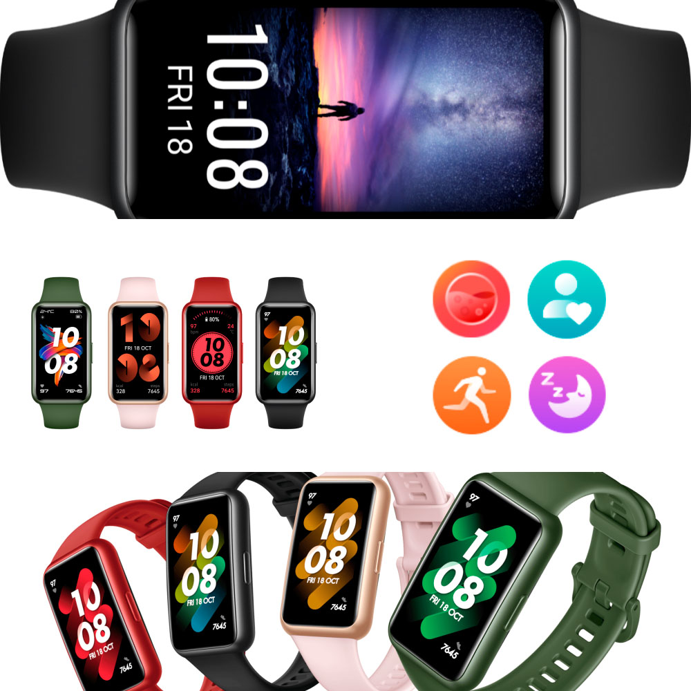 Huawei band 7 com um novo ecrã contendo mais informação e menos moldura dentro de um design Ultra-Fino, monitoriza continuamente a Frequência Cardíaca e SpO2 durante 2 semanas sem necessidade de carregamento.
