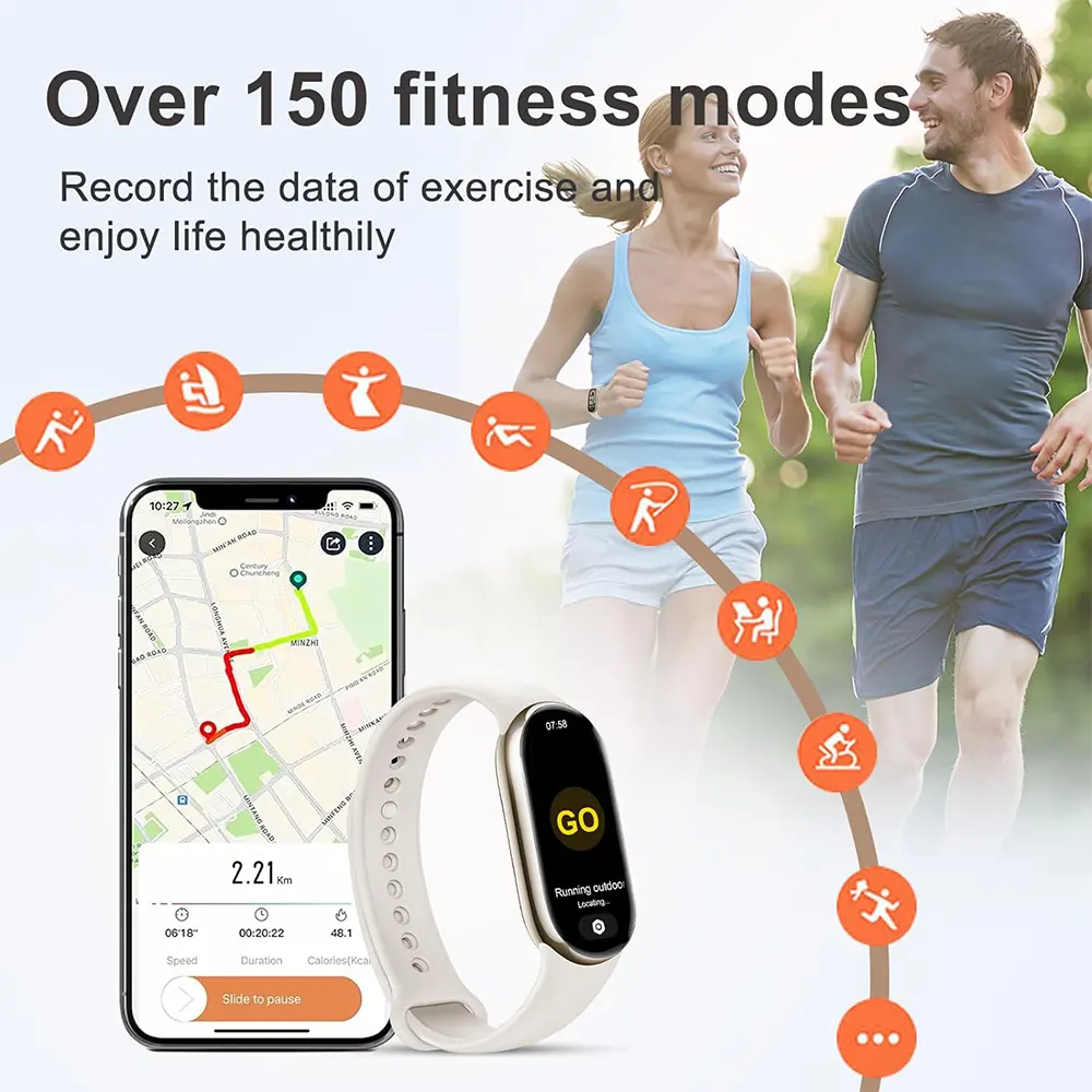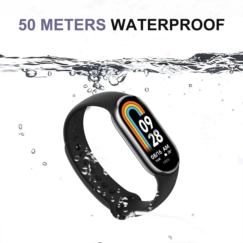 Ecrã AMOLED 1,62" com taxa de atualização de 60Hz e 326 ppi. A Band 8 tem uma resistência à água de 5 ATM.