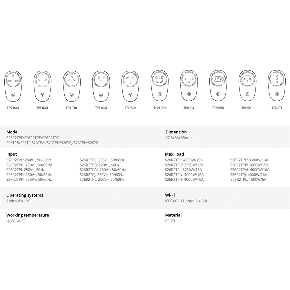 É um tomada inteligente Wi-Fi com padrão EU/US/UK/CN/AU. Conectado com o aplicativo eWeLink para transformar aparelhos existentes em dispositivos inteligentes, conveniente para controlar remotamente em seu telefone